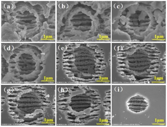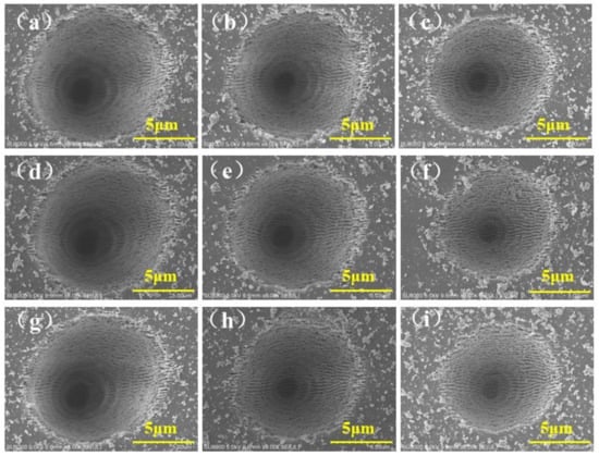 Figure 3 illustrates the microholes’ morphology of ZnS fabricated by different Bessel beam parameters, in which the laser single pulse energy and pulse number altered from 4 μJ to 2 μJ and 1 × 106 to 1 × 104, respectively. When the pulse energy was 4 μJ, the energy density of the zero-order and diffraction rings were much higher than the material damage threshold, resulting in explosions and violent shock waves in and around the microholes. The severe recast at the edge and the annular area of the hole, which was formed by spraying, adhering, depositing, and cooling the molten material in the cavity to the edge of the hole during the ablation process, are shown in Figure 3a. As the number of pulses were reduced from 1 × 105 to 1 × 104, even though the incident accumulated fluence of the material was reduced, the effects were still higher than the material damage threshold. The melting and recasting phenomenon was not well controlled, as displayed in Figure 3b,c. Figure 2f and Figure 3d show the microholes’ morphology with the single pulse energy 3 μJ; as the number of pulses decreased from 1 × 106 to 1 × 104, the microhole evolved to a clear morphology in virtue of the suppression of thermal effects, yet processing areas of the first-order Bessel spot and the first-order diffraction ring still overlapped. As single pulse energy was decreased to 2 μJ, the area of the zero-order diffraction microhole and the first-order diffraction ring could be distinguished, the surrounding ring still existed, as presented in Figure 2h and Figure 3g. When the pulse number dropped to 10,000, a single hole without surrounding rings and with a clean morphology was obtained as shown in Figure 3i, due to the fact that the intensity of the diffraction ring of the Bessel laser was not strong enough to ablate the material.