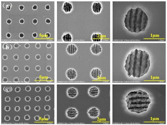 It is worth noting that there were periodic fringes on the bottom and side walls of the hole, on account of the interference effect between the incident laser and excited surface wave during femtosecond laser-material interactions [,]. Wavefront interference fringes can be generated where the surface wave captures electrons more strongly. The nanostructures’ morphology of the nanoripples evolves with the repetition rate, beam polarization, and laser power []. In particular, only a large number of pulses can maintain a plasma standing wave, which can modulate the electromagnetic field on the surface of the sample to produce nanostructures, and for pulses with lower repetition rates, such nanostructures may not emerge [,]. Furthermore, the orientation of the nano-ripples is always perpendicular to laser polarization, which originates from the multi-beam laser interference effect and laser local field enhancement [,]. Consequently, the 10,000 laser pulses used in this experiment can easily form periodic nanostructures at the bottom of the micropores. In addition, the directions of the nanoripples induced by different repetition frequencies and pulse energies were the same since the laser linear polarization state had not changed.