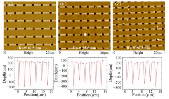 By studying the effect of ASS period on the antireflection effect intuitively and intensively, three kinds of ASS with different periods changing from 3.6 μm to 2.6 μm were fabricated by Bessel beam, as displayed in Figure 4a–c. The recast layer and cracks on the bottom and side wall of microholes were apparently suppressed, and the areas between the microholes were still smooth without splashes or cracks. Figure 5a–c lists AFM images of the ASS on ZnS with average depth of 0.5 μm. It demonstrates that the Bessel beam has experienced undesired nonlinear effects before it converges on the axis, including Kerr self-focusing, multiphoton ionization, avalanche ionization, plasma volume shielding, defocusing, etc., which affect the normal transmission of the beam []. In addition, the surface of ASS measured by AFM is relatively smooth with surface roughness of 16.5 nm and 26.3 nm in a square region of 20 × 20 μm. The smooth surface primarily benefits by Bessel laser with a small heat-affected zone [], which can reduce light scattering to enhance the transmittance.