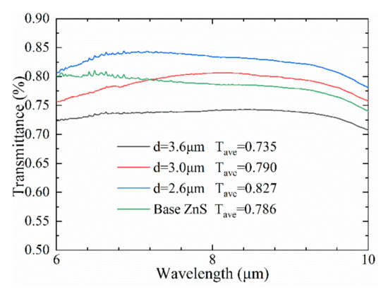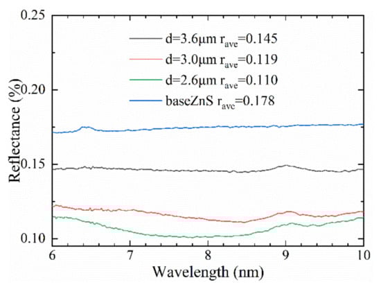 The transmittance of the microhole array with a period of 3 μm showed more interesting phenomena. The spectral transmittance of ASS was lower than that of base ZnS substrate in a broadband from 6 μm to 7.2 μm, but rose by 1.6% in the wavelength of 7.2 μm to 10 μm effectively, and in particular obtained a maximum transmittance of 80.24% at a wavelength of 8.2 μm. As demonstrated in Equation (1), the center wavelength of ASS λ is 9.6 μm; the far-infrared transmittance of the ASS was therefore improved compared to that of the ZnS substrate. The transmittance decreased with a wavelength of less than 7 μm, on account of the fact that the period of 3.0 μm was too close to the wavelength of the incident light, which does not meet the conditions of subwavelength antireflection characteristics. Finally, in the 7.2 μm to 10 μm wavelength range, the 3 μm period ASS has a relatively large refractive index step due to the larger fill factor [], and thus its transmission was slightly worse than the ASS with a period of 2.6 μm. Furthermore, the uneven nanostructure created on the bottom and side wall of microholes increased the surface roughness, enhancing the Fresnel scattering of the light beam inside the micropore, which reduced the transmission of the infrared incident light.