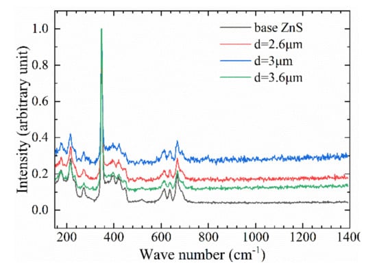 The Raman characteristic peaks displacement of ZnS before and after femtosecond laser processing was basically the same; 350 cm−1 [] corresponds to the longitudinal optical vibration mode (LO) of ZnS as displayed in Figure 8. The difference is that the surface microstructure weakens the Raman scattering signal, causing the entire Raman curve to move downward. Meanwhile, the Raman characteristic peak intensity of ZnS treated with Bessel beam had changed, and its structure was relatively stable without forming a new crystal structure, such as ZnO, and no photooxidation reaction occurred. It also showed that the infrared transmission spectrum change of the ZnS surface was completely determined by the size of the microstructure, rather than the effect of the surface oxide.