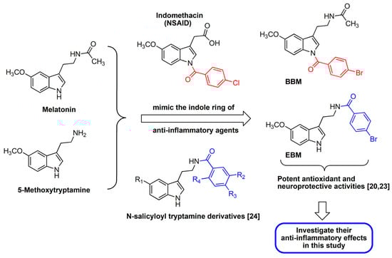 Melatonin and its metabolites, N1-acetyl-N2-formyl-5-methoxykynuramine (AFMK) and N1-acetyl-5-methoxykynuramine (AMK), have antioxidant and anti-inflammatory activities. They are highly efficient NO scavengers [3,4,5,6], and melatonin has been shown to reduce the production of pro-inflammatory cytokines such as interferon gamma (IF-γ), TNF-α, IL-1β, and IL-6, inhibit NO production, and suppress inducible nitric oxide synthase (iNOS) and COX-2 gene expression [4,7,8]. Melatonin has also been shown to exhibit anti-inflammatory effects in vivo [9,10,11]. Although melatonin has low toxicity, its usefulness is limited by its short half-life and low oral bioavailability [12,13,14,15]. Therefore, several synthetic melatonin derivatives that retain melatonin’s bioactivities but improve upon these limitations have been developed [7,16,17,18,19]. N-amide melatonin derivatives that mimic the indole ring residue of Non-Steroidal Anti-Inflammatory Drugs (NSAIDs) were synthesized by our group (Figure 1). The derivatives with bromobenzoylamide-substitutions had higher antioxidant capacity than unsubstituted derivatives, and this affected the electron spin resonance (ESR) signal [20]. This result is supported by the study of Mor et al. who showed that increasing lipophilicity at the indole ring of melatonin improved antioxidant activity [21]. It is well known that inflammation processes are related to increases in free radicals such as reactive oxygen species (ROS) [6].
