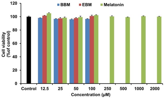 Viability of RAW 264.7 cells after treatment with melatonin, BBM, and EBM in various concentrations. The percentage cell viabilities were calculated relative to viability of the vehicle-treatment group. Values are expressed as means ± S.E.M (n = 8).