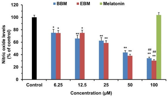 Effect of melatonin, BBM and EBM on the production of nitric oxide in LPS-stimulated RAW 264.7 cells. Values are expressed as the means ± S.E.M * p < 0.05, ** p < 0.001 versus vehicle treatment group, ## p < 0.001 versus melatonin 100 µM.