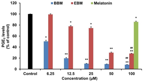 Effect of melatonin, BBM and EBM on the production of PGE2 in LPS-stimulated RAW 264.7 cells. Values are expressed as the means ± S.E.M * p < 0.05, ** p < 0.001 versus vehicle treatment group, ## p < 0.001 versus melatonin 100 µM.