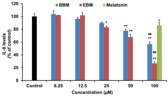 Effect of melatonin, BBM and EBM on the production of IL-6 in LPS-stimulated RAW 264.7 cells. Values are expressed as the means ± S.E.M * p < 0.05, ** p < 0.001 versus vehicle treatment group, ## p < 0.001 versus melatonin 100 µM.
