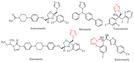 Selected pharmaceutically relevant azoles derivatives and 1,2,4-triazoles emphasized by a red color.