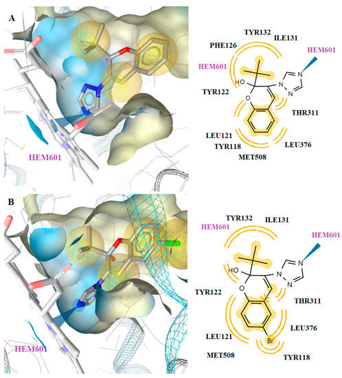 Docked conformation of compounds 3k (A) and 3n (B) in lanosterol 14α-demethylase of C. albicans (CYP51).