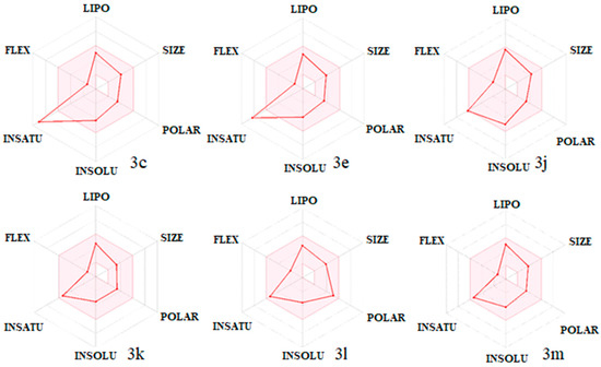 Moreover, the bioavailability radar of some of the compounds is displayed in Figure 7. The most active compound, 3k, appeared to be the best in the in silico predictions, with a drug-likeness score of 0.29 without any rule violation. However, compounds 3k and 3n had stronger interactions than ketoconazole and formed more stable complexes with the enzyme which are the likely reasons for the better antifungal activity than ketoconazole.