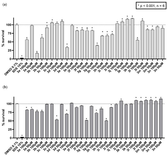 Cytotoxicity activity of the tested compounds. The fourteen derivates were tested in (a) breast cancer cell line MCF7/S0.5 and (b) renal epithelia HK-2 cell line for 48 h in two high concentrations. Results are expressed as the mean ± s.d. of three independent experiments performed in triplicates, where 100% survival was set to the positive control wells (DMSO 0.1%). Statistical assay one-way ANOVA was performed to assess the significance of the results compared to positive control. * p < 0.001 vs. the negative control DMSO.