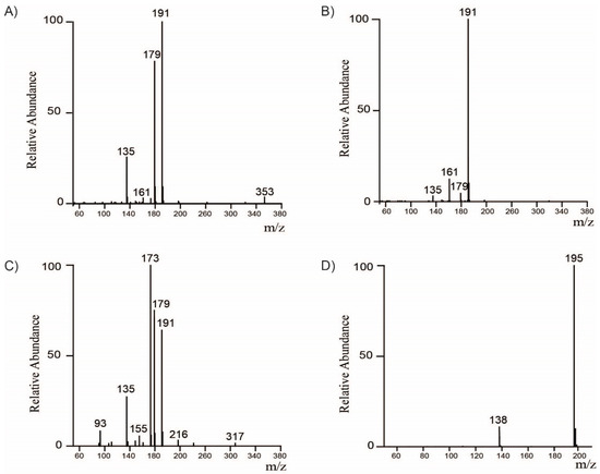 Representative MS/MS spectra of major chlorogenic acids and caffeine. MS/MS spectra of (A) 3-CQA, (B) 5-CQA, (C) 4-CQA, and (D) Caffeine. CQA–Caffeoylquinic acid.