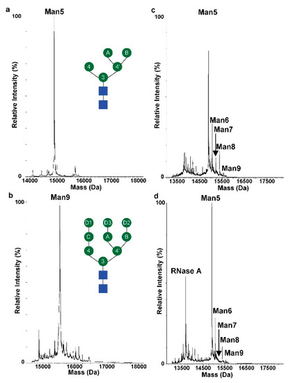 3.1. Preparation of RNase B with Homogenous Man5 and Man9 N-Glycans