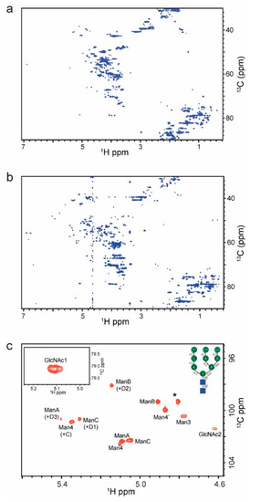 - Unione, L.; Lenza, M.P.; Arda, A.; Urquiza, P.; Lain, A.; Falcon-Perez, J.M.; Jimenez-Barbero, J.; Millet, O. Glycoprofile Analysis of an Intact Glycoprotein As Inferred by NMR Spectroscopy. ACS Cent. Sci. 2019, 5, 1554–1561. [Google Scholar] [CrossRef]