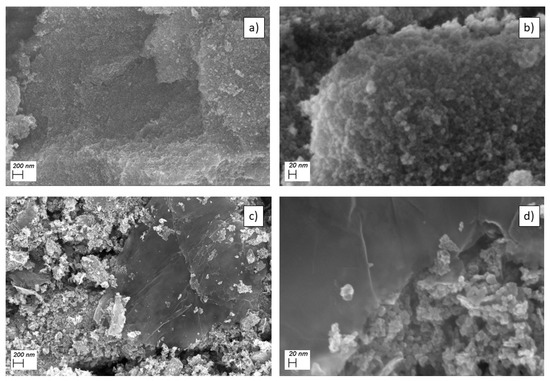 Figure 2c,d show the SEM micrographs of Fe3O4/rGO nanocomposite at 40,000× and 275,000× magnification levels, respectively. In both SEM images, carbon sheets embedding nanoparticles bigger than the pristine oxide are clearly evidenced, suggesting a probable agglomeration during the composite synthesis. At the higher magnification, it is possible to see iron oxide nanoparticles embedded into the amorphous carbon sheets.