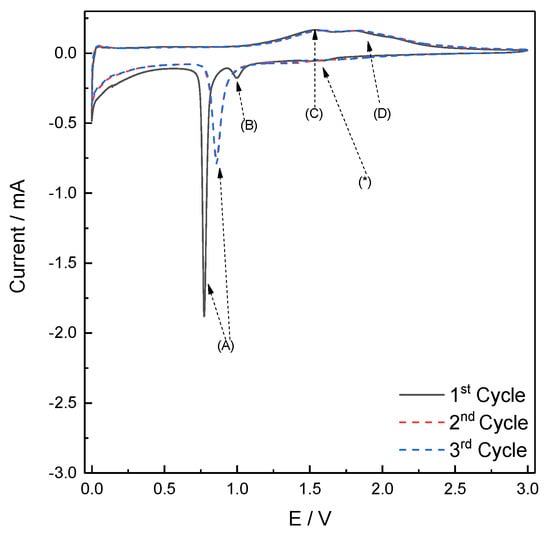 As shown in Figure 4, the voltametric response of Fe3O4/rGO composite material reveals, during the first cathodic scan, three main features: a very broad, and low hump around 1.5 V (*), and two peaks at 1.02 V (B) and 0.75 V (A). The feature around 1.5 V (*) has been observed also for other transition metal oxides [30], and describes irreversible interfacial processes only occurring during the first discharge.