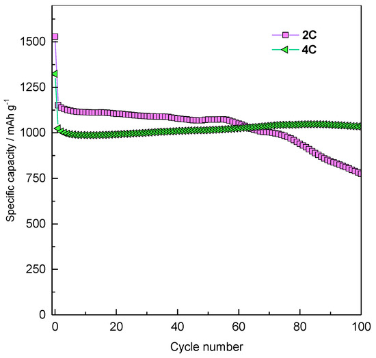 Fe3O4/rGO performances at 2C and 4C rate. The tests were performed at 1762 and 3524 mA g−1 (2C and 4C, respectively), in the potential window within 0.001–3.000 V.