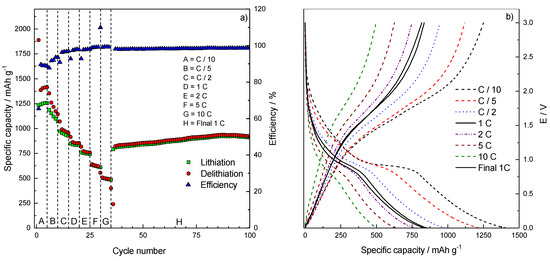As the rate increases, the specific capacity decreases, reaching the minimum of 484 mAh g−1 at 10C with a coulombic efficiency of 99.2%. When the 1C charge/discharge rate conditions are restored, the electrode is able to retain a steady reversible capacity of ~900 mAh g−1. The increase of capacity during the initial cycles at this regime can be ascribed to the progressive electrode morphological rearrangement and wetting by electrolyte, which makes more active sites accessible by Li+ ions.