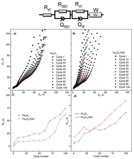 Figure 8a,b shows the Nyquist plots acquired at selected cycles (first cycle, then every tenth cycles) during lithiation of Fe3O4 and Fe3O4/rGO-based electrodes, respectively. The applied bias potentials correspond to the voltametric peak (A) in Figure 4, i.e., E = 0.75 V for the first cycle and 0.9 V for the following cycles. All the impedance dispersions reveal common features, which are typical for a lithium-ion battery anode [6,41,42], namely: (i) an intercept on the real axis corresponding to electrolyte resistance; (ii) a high-frequency arc corresponding to charge accumulation and migration through the passivation layer, partially overlapped by (iii) a medium-frequency arc corresponding to interfacial charge transfer and electrical double layer formation; (iv) a 45° dispersion, bending toward a vertical line, corresponding to diffusion to a blocking electrode.