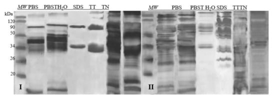 SDS-PAGE separations proteins profiles of samples prepared with6 different extractants. I—egg white, II—egg yolk, MW—molecular weight marker; PBS—phosphate-buffered saline; PBST—pH 7.4 (PBS buffer with 0.05% of Tween 20); H2O dd—acidified with 1M HCl dH2O, pH 6; SDS—4% SDS; TT—1% Tween 20 +0.4% Triton x-100; TN—1% Tween 20 + 0.4% Triton X-100, 280 mM NaCl, 40 mM NaH2PO4, pH 7.4.