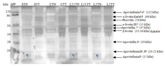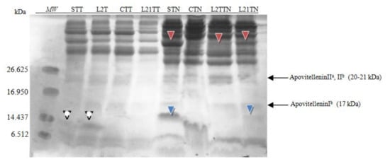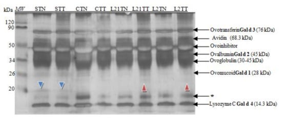 A difference was observed also in the case of hen egg-white samples, where there was an addition of lupine into fodder: L21TT and L2TT. Small amounts of a different protein fraction with amass of ~24 kDa were identified in them as well (red arrowhead). Simultaneously, a decrease in the content of the protein with the molecular mass ~17 kDa (marked by an asterisk) compared to their content in control eggs was observed, especially in eggs obtained from hens fed with soybean-supplemented fodder.