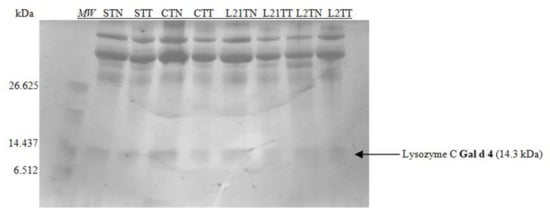 Research indicates that changing the source of protein in fodder does not affect protein concentration but rather protein composition [19,26]. Extracts from the tested eggs were subjected to electrophoresis, using the Laemmli (1970) method [27], in a 14% gel. All known egg allergens in egg white and yolk were successfully identified. Apart from the major egg proteins (Gal d 1, Gal d 2, Gal d 3 and Gal d 4), differences in protein profile were also found between samples C, S, L2 and L21, while testing the chicken egg white by using the 14% gel. Two sample-differentiating protein fractions with molecular weights not corresponding to any common white protein were identified (Figure 2) [19]. The first, with a molecular mass of ~20 kDa (blue arrowhead), was found only in chicken egg white samples (STT and STN) obtained from eggs laid by hens fed with soybean-supplemented fodder. This indicates that soy proteins in the fodder may potentially affect the expression of new proteins in the egg. It may be an egg protein but with an altered primary structure, depending on the essential amino acids composition in the protein source (soy). This was also the case for samples of egg white from eggs laid by lupine-fed hens (L21TT and L2TT). They included a protein fraction with amass of ca. 23 kDa (Figure 2, red arrowhead). Compared to the control eggs, a decrease in the content of proteins with a molecular weight of ~17 kDa was observed as well, especially in eggs obtained from hens fed with soybean-supplemented fodder (STT and STN). At this stage of the study, it is impossible to indicate the mechanism responsible for the formation of the different proteins present in the samples. The origin of these new proteins should be carefully examined by proteomic analysis of fodder, eggs and blood. A lack of differences between the samples after peptide separation (in the 16.5% gel) may result from the gel’s structure and blocking protein separation (Figure 3).