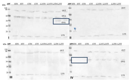 In the case of egg white (Figure 6), the antibodies contained in the sera recognized some of the major fractions of the egg white, depending on the serum used. Antibodies present in serum No. I detected Gal d 3 (OVT), Gal d 2 (OVA) and Gal d 3 (LYS). In serum No. II, we found Gal d 3 and Gal d 4. Moreover, an unknown fraction with a molecular weight of approximately 20 kDa was identified as well (extracted by TN from S sample) (blue arrowhead). This fraction was also detected in that sample by SDS-PAGE electrophoresis (compare Figure 4). This could potentially indicate that this unidentified protein found in the egg white has significant immunoreactivity. The antibodies in serum No. III react with the protein fraction with a molecular weight of approximately Gal d 3 and the fraction of molecular weight by Gal d 4. Three protein fractions were identified by serum No. IV: Gal d 3, OVG and Gal d 4. There were differences in terms of the detection of OVG observed after immunostaining with sera I and IV, as well as the lack of detection of Gal d 3 and Gal d 4 by serum II in the STN sample.