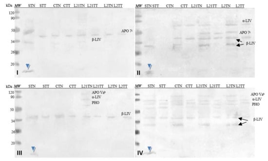 Corresponding analyses were also performed for hen’s egg-yolk proteins (Figure 9). The used sera did not detect yolk allergens (Gal d 5—α-LIV and Gal d 6—β-LIV) in all samples, because these allergens are not common for children [8]. However, antibodies contained in each of the used sera cross-recognized a protein fraction with a molecular weight of approximately 13 kDa (blue arrowhead). This fraction was present only in the STN sample (hens fed with soybean-supplemented fodder for 21 days). The identical results were demonstrated after the application of the sera of patients allergic to eggs (compare Figure 7). Additionally, the reactivity of this protein is really strong compared to others present in the prepared extracts (stronger by approximately 15%).