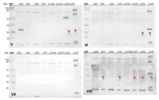 Soy-sensitized antibodies recognized all allergens of egg white, i.e., Gal d 3 (OVT) and Gal d 4 (LYS). Some of them (V, VII and VIII) also recognized AVI and Gal d 1 OVM in some samples (V, VI and VIII) (Figure 8). The differences in detection of test samples by these sera do not appear to be significant. Interestingly, the antibodies contained in sera V, VI and VII cross-recognized a protein fraction with a molecular weight of approximately 23 kDa (red arrowhead), which is not the major’s egg-white protein. This fraction was recognized in egg-white samples with the addition of lupine to chicken fodder (L21TT, L2TN and L2TT), but the reactivity was slight. However, serum VIII detected the protein also in sample STT and CTT.