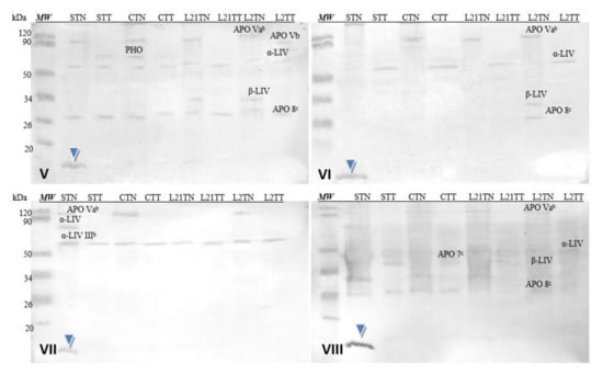 Images of the membrane obtained as a result of the Western-blot analysis with the sera of four patients allergic to soy (V–VIII) for egg’s yolk. APO Vab—apovitellinin Vab, APO Vb—apovitellinin Vb, PHO—phosvitin, APO 7c—apovitellin 7c, APO 8c—apovitellin 8c, α-LIV—α-livetin, β-LIV—β-livetin. Hen eggs were obtained after feeding the hens with soy, lupine or without adding legumes: S—soy for 21 days; C—control without legumes; L2—lupine for 2 days; L21—lupine for 21 days; TT—1% Tween 20 +0.4% Triton x-100; TN—1% Tween 20 + 0.4% Triton X-100, 280 mM NaCl, 40 mM NaH2PO4, pH 7.4, MW—molecular weight marker.