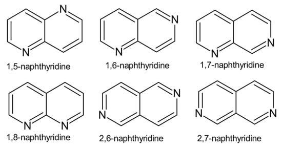 Naphthyridines are a class of heterocyclic compounds that are also referred to in the chemical literature as “benzodiazines” or “diazanaphthalenes”, due to possessing a fused system of two pyridine rings. There are six positional isomers with different locations of nitrogen atoms (Figure 1).
