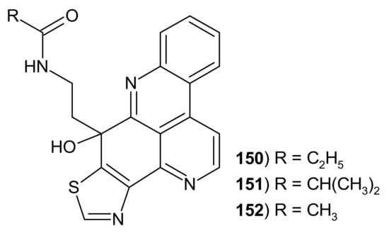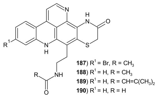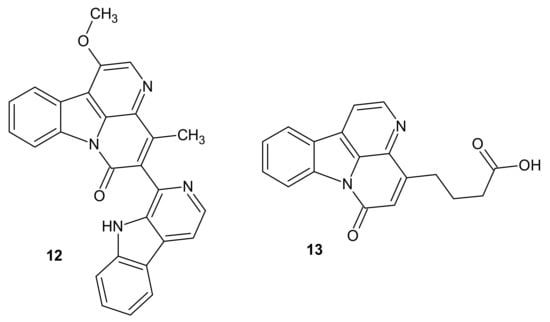 - Delfourne, E.; Bastide, J. Marine pyridoacridine alkaloids and synthetic analogues as antitumor agents. Med. Res. Rev. 2002, 23, 234–252. [Google Scholar] [CrossRef] [PubMed]