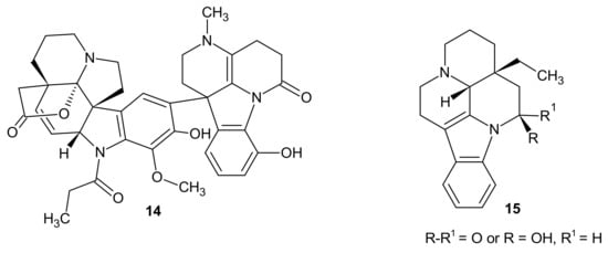 Natural products—cimiciduphytine 14 and eburnane derivatives 15 (Figure 4)—were evaluated as natural painkillers and antihypertensive agents, which could be used in cerebral circulation disturbance therapy [16].
