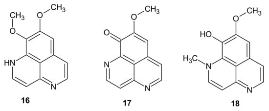 - Lúcio, A.S.S.C.; Almeida, J.R.G.D.S.; Barbosa-Filho, J.M.; Pita, J.C.L.R.; Branco, M.V.S.C.; Diniz, M.D.F.F.M.; Agra, M.D.F.; Da-Cunha, E.V.; da Silva, M.S.; Tavares, J.F. Azaphenanthrene alkaloids with antitumoral activity from Anaxagorea dolichocarpa sprague & sandwith (Annonaceae). Molecules 2011, 16, 7125–7131. [Google Scholar] [CrossRef] [Green Version]