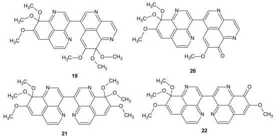 Beside aaptamine 16 and its major analogues demethyl(oxy)aaptamine 17 and isoaaptamine 18, other 1,6-naphthyridines have been successfully isolated from marine sponge Aaptos. Liu et al. [33] obtained four novel 1,6-naphthyridine alkaloids, suberitine A-D 19–22 (Figure 6), and two known alkaloids, demethyl(oxy)aaptamine 17 (Figure 5) and 8,9,9-trimethoxy-9H-benzo[de][1,6]naphthyridine 23 (Figure 7), from the Aaptos suberitoides.