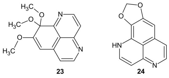 Toshiyuki Hamada et al. [34] isolated 8,9,9-trimethoxy-9H-benzo[de][1,6]naphthyridine 23 and 1,3-dioxolo[4,5-d]benzo[de][1,6]naphthyridine 24 (Figure 7) from the Bornean Aaptos aaptos and tested their cytotoxicity against adult T-cell leukemia cells. Compound 24 revealed a significant antitumor effect with an IC50 value of 0.29 µM, while alkaloid 23 remained inactive.