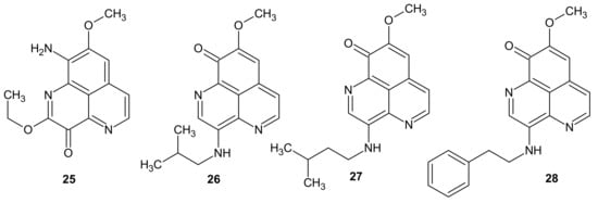 Yu et al. [35] isolated nine novel and three previously-known aaptamine derivatives from the South China Sea sponge Aaptos aaptos. Four of the compounds: 9-Amino-2-ethoxy-8-methoxy-3H-benzo[de][1,6]naphthyridin-3-one 25, 3-isobutylaminodemethyl(oxy)aaptamine 26, 3-(isopentylamino)demethyl(oxy)aaptamine 27, and 3-(phenethylamino)demethyl(oxy)aaptamine 28 (Figure 8) revealed potent anticancer activity with IC50 values in the range of 0.03–8.5 μM against human cancer cell lines: HL60 leukemia, K562 erythroleukemia, MCF-7 breast cancer, KB epidermoid carcinoma, HepG2 hepatocellular carcinoma, and HT-29 colon adenocarcinoma [35].