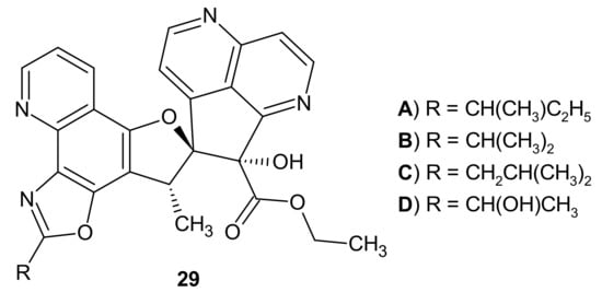 RANKL (Receptor Activator for Nuclear Factor κB Ligand) is a transmembrane protein that controls bone regeneration and remodeling. Wang et al. [36] performed biological examination of four 1,6-naphthyridines analogues, aaptodine A–D 29 (Figure 9), derived from Aaptos suberitoide. Aaptodine A–D 29 inhibited impressively RANKL-induced osteoclast formation and resorption, with the strongest effect for aaptodine D 29D. Hence, aaptodines could be considered as candidates for drugs used in treating osteoporosis and hormone therapy-induced bone loss.