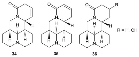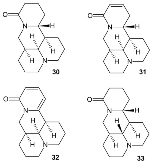 Extract isolated from the seeds of Sophora alopecuroides matrine 30, sophocarpine 31 and sophoramine 32 (Figure 10), with contents, respectively, of 32.85%, 26.55%, and 6.91%, have alleviated morphine withdrawal in patients [52]. Moreover, these alkaloids 30–33 displayed strong antitumor properties. Matrine 30, sophoridine 33 (Figure 10), and sophocarpine 31 exerted potent cytotoxic activity against HL-60 human leukemia, U937 human myeloid leukemia, K562 human erythroleukemia, EC109 esophageal squamous cell carcinoma, A549 non-small cell lung cancer, and HepG2 hepatocellular carcinoma cell lines, with IC50 values in the range of 1.21–12.86 mM [53]. Matrine 30 and sophocarpine 31 decreased cachexia symptoms (induced by colon carcinoma) in mice, and the mechanism of action was related to the suppression of TNF-α and IL-6 production [54]. Additionally, sophoramine 32 and sophocarpine 31 displayed antinematicidal activity against Bursaphelenchus xylophilus, pine trees parasite, and it was observed that degree of unsaturation in the -lactam ring correlated with the strength of antinematicidal activity [55].
