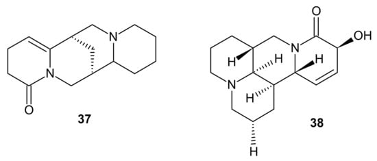 Li et al. [57] isolated 43 natural alkaloids from the seeds of Sophora alopecuroides. Assessment of anti-inflammatory efficacy was measured as suppression of NO production in LPS-activated RAW 264.7 cells. Among Sophora alkaloids, 5,6-dehydrolupanine 37 (Figure 12) exerted the most potent effect (IC50 value of 25.86 μM), higher than that of matrine. On the other hand, another 1,6-naphthrydidine derivative sophalode K 38 (Figure 12) decreased significantly the secretion of enzymes playing crucial role in development of inflammation: iNOS (inducible nitric oxide synthase) and COX-2 (cyclooxygenase 2).