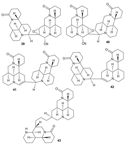 Fan et al. [58] obtained five novel 1,6-naphthyridine alkaloid dimers, alopecuroides A−E 39–43 (Figure 13), from the aerial parts of Sophora alopecuroides. The study revealed strong anti-inflammatory properties of alopecuroides B 40 and C 41. TNF-α and IL-6 levels were, respectively, 50.05% and 52.87% for alopecuroide B 35b and 49.59% and 73.90% for alopecuroide C 41 in LPS-induced RAW 264.7 cells [58].