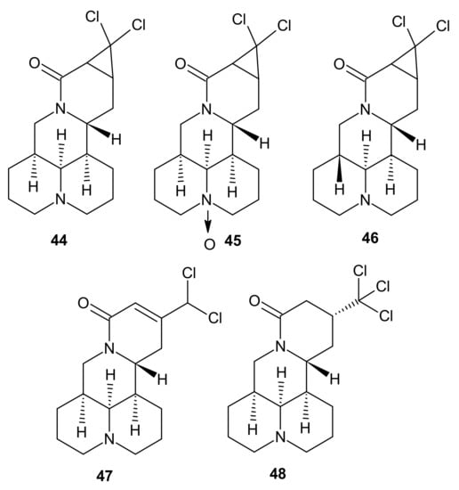 Sophora alkaloids were also reported to exhibit immunosuppressive properties. Alopecines A-E 44–48 (Figure 14), isolated from the seeds of Sophora alopecuroides, were assessed toward inhibiting proliferation of Concanavalin A-induced T lymphocytes and LPS-induced B cells [59]. Alopecine D 47 exerted the most potent effect, with IC50 = 3.98 μM for inhibiting proliferation of T lymphocytes and 3.74 μM for B lymphocytes (SI ratios respectively 8.0 and 8.5).