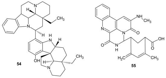 Bisleuconothine A 54 and 1-N-methyl-3-methylamino-[N-butanoicacid-3-(9-methyl-8-propen-7-one)-amide]-benzo[f][1,7]naphthyridine-2-one 55.