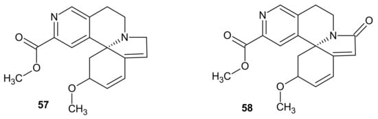 Erymelanthine-methyl(2R,13bS)-2-methoxy-2,6,8,9-tetrahydro-1H-indolo[7a,1a][2,6]naphthyridine-12-carboxylate 57 (Figure 18) was isolated from Erythrina melanacantha and E. velutina [70]. This alkaloid 57 was also obtained from Erythrina merilliana seeds by Jackson et al. [71]. Erymelanthine 57 was evaluated regarding its TRAIL (tumor necrosis factor-related apoptosis-inducing ligand) enhanced activity, and this alkaloid showed no cytotoxicity [72].