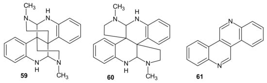 Dibenzo[c,h][2,6]naphthyridine named calycanine 61 (Figure 19) was isolated from the seeds of Chimonanthus praecox [81]. This alkaloid 61 was also obtained by Zn dehydrogenation of calycanthine 59 [82]. Calycanthine 59 and calycanine 61 were evaluated for their antifungal activities. Bipolaris maydis was susceptible to calycanthine (EC50 = 29.3 μg/mL) [83]. Calycanthine 59 was evaluated for its potent melanogenesis inhibitory activity, but showed cytotoxicity at 10 µM [84].