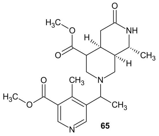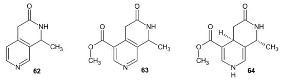 Some of the monoterpenoid alkaloids of 2,7-naphthyridine structure were isolated from Oleaceae species [85]. Jasminine 62 (Figure 20) was obtained from the leaf of Ligustrum novoguineense by Hart et al. [86]. Jasminine 62 at a dose of 300 mg/kg causes a slight decrease in motor activity in mice. Cardiovascular activity of this alkaloid 62 was also evaluated, but it showed no significant effects [87].