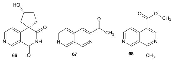 3-Acetyl-2,7-naphthyridine 67 (Figure 22) was isolated by Janot et al. [94] from the roots and rhizomes of Valeriana officinalis. This compound 67 exhibited sedative and tranquilizer activity [94].