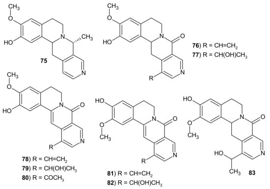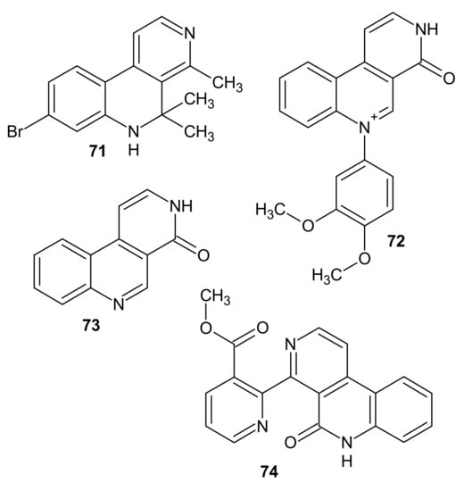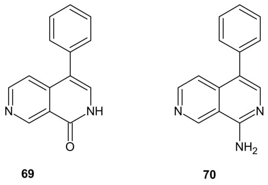 Bioactive alkaloids Lophocladine A 69 and lophocladine B 70 (Figure 23) were isolated from the marine red alga Lophocladia sp. by Gross et al. [96]. 4-Phenyl-2,7-naphthyridin-1-one 69 exhibited antagonistic activity against δ-opioid receptors, and 1-amino-4-phenyl-2,7-naphthyridine 70 showed cytotoxic activity against human lung tumor and breast cancer cell lines [96].