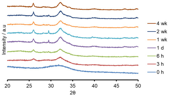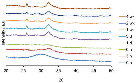 The ATR-FTIR spectra show the loss of the NBO vibrations upon immersion at 880 and 920 cm−1 and the formation of strong bands at 560, 600 and at 1030 cm−1, corresponding to a crystalline calcium orthophosphate of which apatite is a possibility. In addition, there were weaker bands at 870, 1420 and 1480 cm−1 corresponding to carbonate vibrations suggesting a carbonated apatite was forming. XRD following immersion shows the formation of an apatite PDF 09-0432 with the 002 diffraction line at approximately 25.8° two theta and a broad peak at 30–34° two theta corresponding to the overlapping 211, 112, 300 and 202 diffraction lines of apatite. In addition, a weak diffraction line at 29.4° two theta was present corresponding to calcite (CaCO3) that indicates that not all the CO32− ions were within the apatite lattice. The formation of apatite was apparent by 3 h by both ATR-FTIR and XRD.