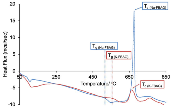 The DSC trace for Na-FBAG exhibited a glass transition (Tg) of 520 °C whilst that for K-FBAG was somewhat higher at 550 °C (Figure 5). This reflected the fact that some of the fluorine was present as nanocrystalline FAp, which reduced the fluorine content of the residual glass phase, thereby increasing the Tg. The crystallization temperature (Tc) was slightly higher for Na-FBAG than K-FBAG at 676 °C and 665 °C respectively.