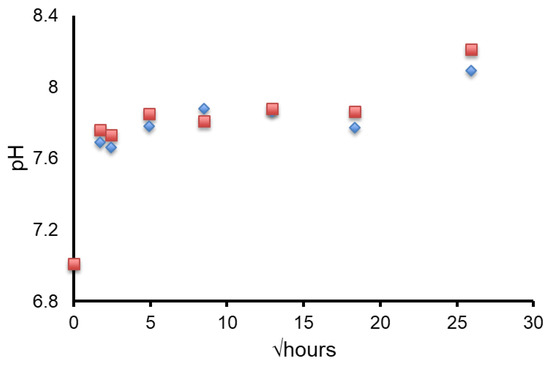 The pH change upon immersion of both Na-FBAG and K-FBAG were both the result of ion exchange of Na/K+ and Ca2+ ions for H+ ions in the AS7. This ion exchange process reduced the H+ ion concentration in the AS7 resulting in a pH increase. The two glasses had almost identical pH rises as a function of time. This reflects the fact that the ion exchange occurred with the silicate part of the glass structure, which was very similar between the two glasses.